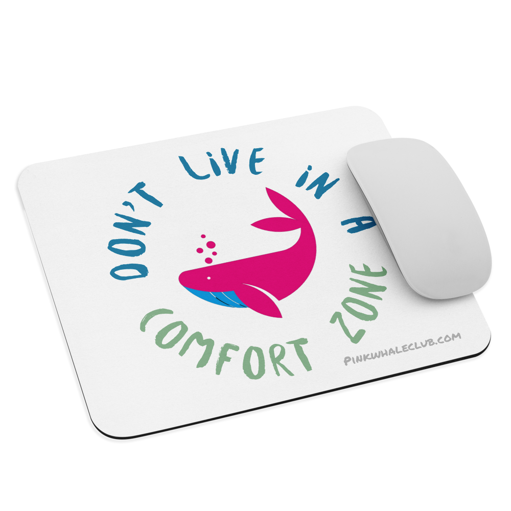Introducing the ultimate desk accessory for anyone who's tired of living in a comfort zone - the “Don't Live in a Comfort Zone” Mouse Pad! With its bright and bold design, featuring the Pinkwhale Club logo and a tongue-in-cheek message, this mouse pad is sure to liven up any workspace.